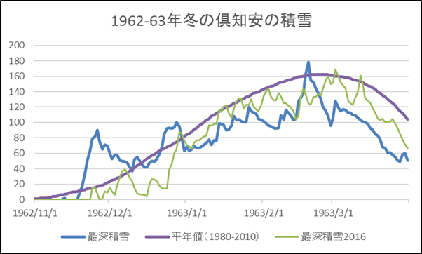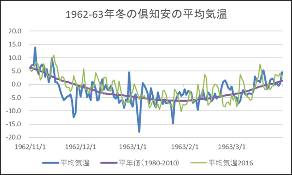 本当は当時の天気図でも見てみたいところですが、すぐに探せるところにいないのでこちらはあきらめて、気象庁のホームページから当時(1963年冬)の倶知安の気象がどんなだったか調べてみました。